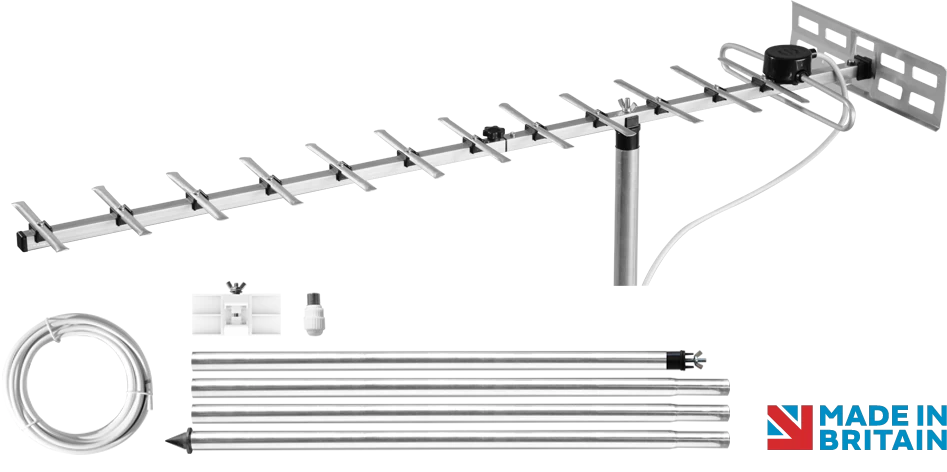 The 14 Element Mobile TV Aerial is ideal for medium signal areas where a temporary mount solution is preferred. Complete with Unimax Clamp, mast and coaxial cable, the 14 Element Directional Aerial Kit offers everything you need to mount the aerial and route to a TV.