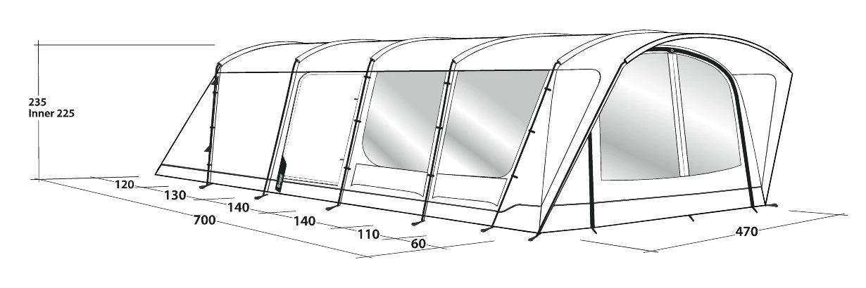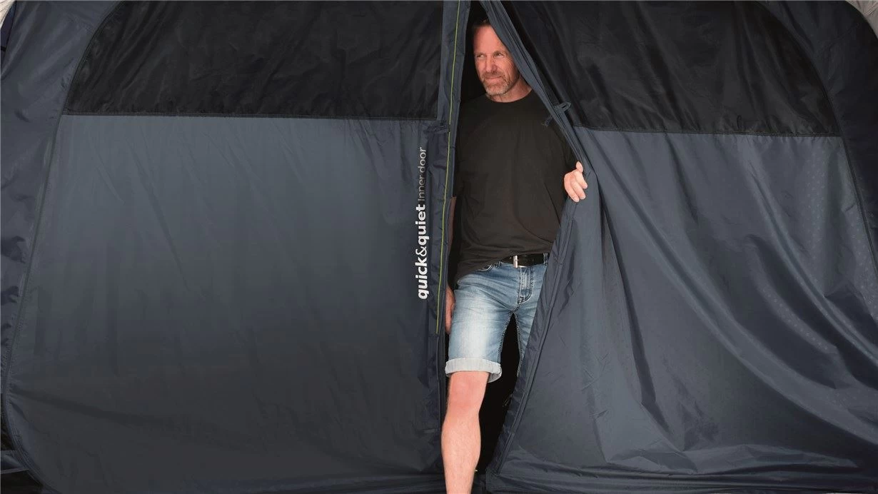 Sleeping seven in three Ambassador Master Bedrooms with Dark Inners and Quick & Quiet Inner Doors, the Vermont 7PE offers spacious, light-filled tent living. Easy opening of the steep front door under the extended front plus twin side D-doors with mesh offers flexible access and extends ventilation options. Pre-bent poles deliver superb stability plus steep walls to maximise internal space and offer full headroom. Home from home comfort and convenience is assured with Quick & Quiet Access to zone 2, the Outwell HookTrack System, Easy Pegging System, Cable Entry, zip-up curtains, Rear Ventilation System and low side vents.