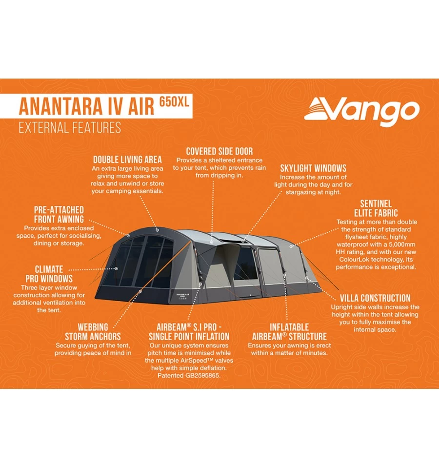 The Anantara IV Air 650XL offers the perfect balance of innovative design and generous space perfect for family camping holidays. This 6-man inflatable tent features our award-winning AirBeam S.I Pro® Single Point Inflation System, designed to make pitching even easier. The pre-attached front awning creates a completely separate living area to use for food preparation, dining or storage. Featuring Tinted Diamond Pro windows, this tent offers additional privacy and insulation and benefits from our Midnight Bedrooms, keeping the morning light at bay. Spacious dimensions are enhanced by SkyLight Windows and the near vertical walls of the Villa Construction style giving a greater bright and airy space. Benefitting from our Sentinel Elite Fabric, highly waterproof with a 5,000 mmHH rating, and ColourLok™ technology, its performance is exceptional. AirZone panels provide additional airflow throughout the tent, alongside the Climate Pro Windows, a three-layer window construction of mesh, curtain and PVC, offering advanced climate control. With many additional options including the zip on Studios for extending your space, it is certainly the ultimate family tent.